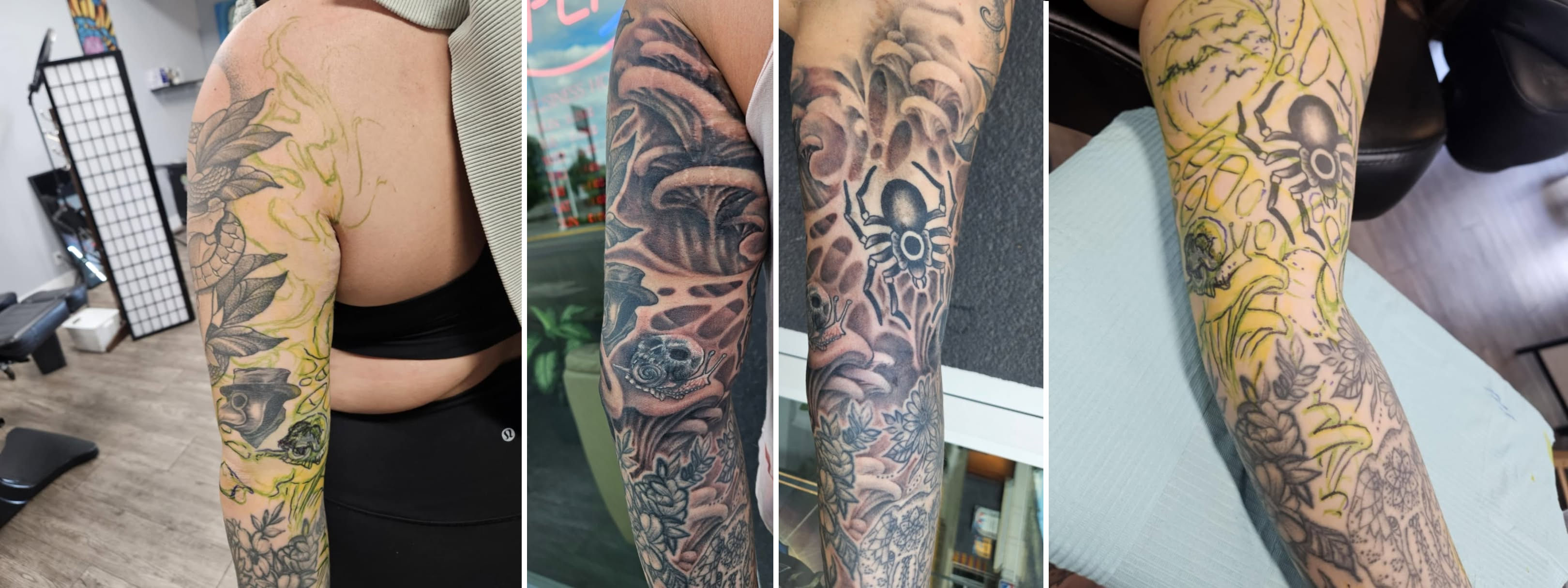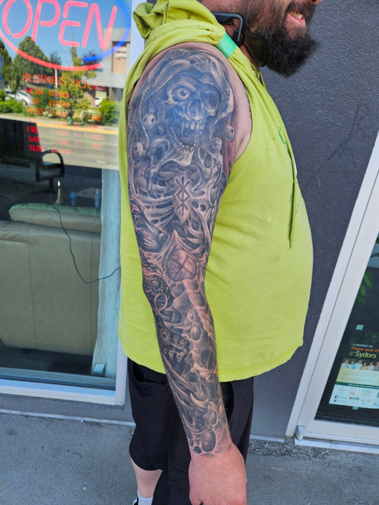 Cover up/redo on shoulder, stenciled Anubus and the hourglass and freehand all the biomech stuff.